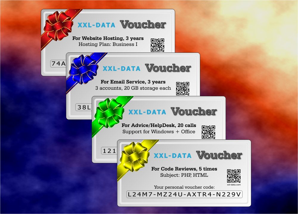 To make things easier for THEM, we do everything to get their stuff work. To make things easier for US, we can ensure that the right target group will use our services by using vouchers. These vouchers will be directly handed over by certified XXL-DATA representatives or other people who are connected to XXL-DATA, businesswise or socially.